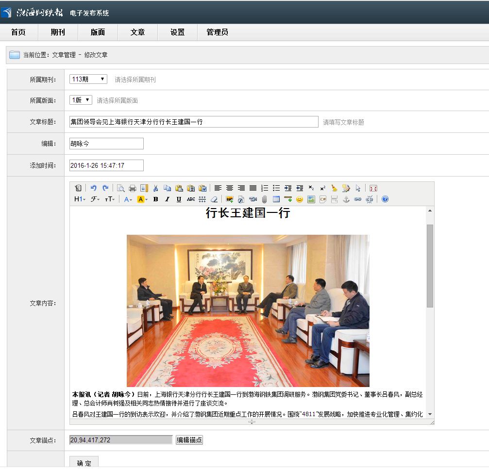 該報(bào)刊后臺(tái)操作也十分人性化,可以及時(shí)更新、刪減、修改欄目,隨時(shí)上傳、更新圖片,還可以分別按刊號(hào)日期、按版面智能查詢。